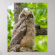 Ein wundervolles Bild einer süßen, schwindelnden Eule, die auf einem Ahornbaum steht und die Kamera anstarrt.