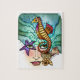Eine fantastische Vision einer Frau mit flüssiger Ozeanwellen-Haarschwimmen unter dem Ozean mit einem playful lila und orange Seepferd, ein spirited blauer violetter Starfish, drei natürliche getonte Muscheln, die mit hellem betont werden, türmend sprudelt.