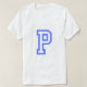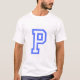 Das ist ein Männer-T - Shirt. Das Shirt ist komfortabel, lässig und locker. Der schwere T - Shirt wird leicht zu einem Schrankstapel. Aus 100% Baumwolle hergestellt, ist es unisex und trägt gut auf jeden und jeden. Der T - Shirt ist weiß und auf der Vorderseite des Shirts befindet sich ein großer Buchstabe P. Der Stil des Briefes ist Yearbook. Sie haben doppelnadelgeheftete Untersohle und Ärmelheme für eine besonders lange Lebensdauer. Der T - Shirt passt sich der Größe an. Das Shirt besteht zu 100% aus Baumwolle.