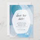 Dieses einzigartige Save the Date besticht durch abstrakte Wasserfarbe in aquamarin-blauen Farbtönen.