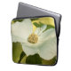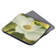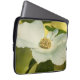 Ein nah aufgenommenes Foto zeigt eine weiße pazifische Hundsholzblüte in voller Blüte. Die Blume besteht aus vier großen, leicht zerknitterten Blütenblättern in cremeweißer Farbe. Im Zentrum der Blüte befindet sich ein Haufen kleiner, gelb-grüner Flöten. Der Hintergrund ist mit einer weichen Blüte aus grünem Blattwerk und gelben Farbtupfern gestaltet, was auf eine natürliche Umgebung im Freien hindeutet.
