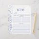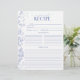 Conçu pour accompagner notre Classeur de recettes de Fête des mariées assorti, faisant partie d'une suite d'invitation à la douche nuptiale, cette page de classeur de recettes branchée présente des fleurs victoriennes bleues à la main classiques de fleurs de jardin, d'abeilles et de papillons, ainsi que de la calligraphie moderne lettrée à la main. Il y a beaucoup de lignes pour la recette, et le dos correspond à l'avant, pour que chaque invité puisse donner à la mariée deux recettes. Voir la suite ici : https://www.zazzle.com/collections/french_blue_white_victorian_floral_bridal_shower-119265327422133417 Contacter le concepteur pour les produits correspondants. Copyright Surridge Design Co. pour Invitations élégants, tous droits réservés.