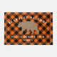 "Les pieds d'ours bienvenus Please Remove Shoes" texte blanc sur un arrière - plan en plaid de buffle orange et noir avec silhouette d'ours inspirée des burlaps au centre.