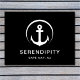 Porte moderne sur le thème nautique pour votre bateau qui présente une illustration blanche d'une ancre dans un cercle sur un arrière - plan noir. Personnalisez avec le nom et l'emplacement de votre bateau dans une simple typographie blanche.