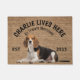 Beagle Amoureux des chiens personnalisé mat de bienvenue . Ce tapis de bienvenue peut être personnalisé avec le nom de votre chien, le slogan peut aussi être changé ou vous pouvez utiliser une photo de votre propre chien (assurez-vous qu’elle est transparente). Texte : Charlie vit ici... Tous les traitements sont les bienvenus Modifier le design pour changer la police, les couleurs et la couleur arrière - plan. Lorsque vous remplacez l'image de votre chien, utilisez une image transparente. Fait un cadeau merveilleux pour une fête de ménage, vacances, amoureux de les chiens et la plupart de toutes les occasions.