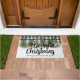 Belle neige automne saison hiver matelas mignon. Ce mat de noël est un buffle noir et blanc plaid dans l'arrière - plan. Il a l'air si douillet avec la chute de neige et les pinèdes aquarelles. Le Text Joyeux Noël est personnalisable et le nom de famille aussi.
