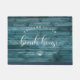 Écriture de brosse moderne et chic Lire BIENVENUE À NOTRE MAISON DE PLAGE dans un design branché à la typographie. Superbe décoration de maison de plage personnalisée pour votre maison loin de la maison. A la fois romantique et élégante, notre tapis de porte en bois flotté imprimé turquoise présente une illustration en coquille douce entre votre emplacement et l'année établie.