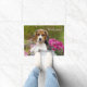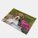 Un jeune chiot Beagle aux yeux de chiot est assis dans une églises de lait et de fleurs roses L'Beagle est une race de chien de scène au tempérament doux. Une jolie photo de chien prise par Katho Menden. Ce paillasson est une idée cadeau pour les amoureux de les chiens.