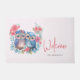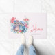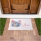 Un tapis de bienvenue avec l'image d'une paire de chouettes amoureuses assis ensemble sur une branche d'arbre. Entouré de jolies fleurs bleues, vertes et roses.