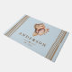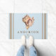 Illustration élégante de coquille de conque au centre. L'arrière - plan a une couleur bleue douce et un texte personnalisé de nom de famille dans le brun. Cette natte est élégante, chic, et ferait une grande impression sur vos invités de maison car ils sont bien accueillis à votre maison !