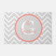Ajoutez un sentiment de bienvenue à votre porte d'entrée avec un tapis de porte Coral Chevron Monogram. La conception des nattes comporte un motif de chevron gris clair avec un emblème de cercle dessiné dans le corail. Autres articles disponibles avec cette conception aussi. Contactez-moi directement pour obtenir de l'aide sur la personnalisation.