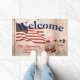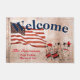 Ajoutez votre nom, votre famille dans une police de script et d'abord dans une police de bloc, en rouge sur un arrière - plan beigy d'aspect patiné vintage dominé par un drapeau américain volant et un joli jeu de fiction et de batterie noir et rouge dessiné à la main. "Bienvenue" est inscrit dans une police bleu foncé et audacieuse sur le dessus du design.