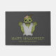 Ce tapis à thème d'Halloween présente l'illustration originale de Destei d'un personnage zombie vert effrayant qui a les bras en haut et une partie de son cerveau est visible. Sous l'image on peut lire "Happy Halloween !" ainsi qu'une zone de texte personnalisable pour un nom de famille, par exemple.