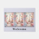 Welcome doormat with a stylized Eiffel tower image surrounded by pretty butterflies and delicate garden flowers.