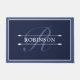 Élégant tapis minimaliste imprimé avec votre initiale dans un joli script avec votre nom de famille écrit entre deux séparateurs avec des points de flèche en blanc et bleu marine.