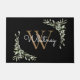 Tapis de sol personnalisé élégant avec monogramme floral aquarelle verdure avec un monogramme or initial avec votre nom écrit dans un script blanc moderne sur un fond noir chic. Conçu par Thisisnotme