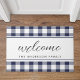 Porte d'accueil de style ferme sur mesure avec nom de famille personnalisé sur motif à chèques de buffles bleu marine et blanc.
