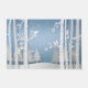 Décor de découpe de papier frappant en bleu et blanc avec des arbres, des écureuils et des flocons de neige.