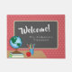 Ce tapis de bienvenue de classe présente une illustration d'un bureau d'enseignant agrémenté d'un globe terrestre, de livres, de pommes et de crayons. Le tableau de bord apparaît sur un arrière - plan de pois rose et saumon et propose un texte personnalisé pour le nom de l'enseignant.