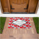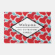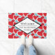 Un tapis d'accueil convivial avec un motif extensible de 2 coeurs rouges gras de taille différente chaque coeur entouré d'une bordure extérieure blanche. Un cadre en forme de losange superposé avec votre texte à l'intérieur.