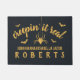 Tapis classique et élégant pour Halloween pour l'automne avec foncé, gris éffrayant faux burlap arrière - plan - "creepin' it real" texte en beurre orange avec chauves-souris, une araignée et votre nom de famille
