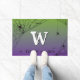 Des toiles d'araignées éffrayantes et des araignées ornent ce tapis. Arrière - plan est un dégradé violet à vert. Grand, blanc avec ombre noire, monogramme initial simple au centre dans une police d'araignée. En bas, on peut lire : "entrez si vous osez." Amusez-vous pour les astuces à votre porte cet Halloween !
