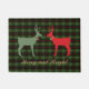 Ce joli tapis est gardé par deux rennes - un rouge et un vert - dressé contre un arrière - plan plaid vert et noir. Le texte "Joyeux et lumineux" apparaît sous le renne, mais vous pouvez le changer en un autre message ou ajouter votre nom à la place.