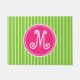 Ce mignon tapis de porte présente des rayures vert citron et blanc éclatant. Personnalisez le monogramme rose et blanc girly avec votre choix de l'initial.