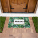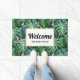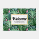 Porte d'accueil personnalisée faite avec une image de grands feuilles tropicaux verdoyants et feuillus avec une pointe de rose derrière. Peint avec des acryliques et numérisé. Un cadre blanc avec une fausse bordure en feuille d'or superposée avec le texte Bienvenue, et votre nom de famille personnalisé à l'intérieur.