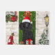 Poodle Dog Noël assis à l'extérieur de la maison décorée avec la couronne de Noël, le sapin de Noël est une idée cadeau de Noël parfait pour les amoureux de les chiens.