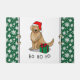 Joyeux Noël Père Noël Golden Retriever - Drôle chien souriant avec un chapeau de Père Noël et un cadeau de Noël. HO, oh ! Copyright © Angi Laframboise. Les mignons chiens de vacances produisent des cadeaux de Noël caricaturaux pour les amoureux de les chiens.