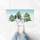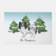 Illustration originale de Destei d'un chien de race Papillon en noir et blanc vêtu. Le chien est placé dans une scène hivernale avec trois sapins verts et la chute de neige. L'arrière - plan est un dégradé bleu à blanc qui donne un aspect froid d'hiver. Il y a aussi une zone de texte personnalisable pour un nom.