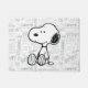 Cette oeuvre Peanuts présente Snoopy assise sur l'arrière - plan de bandes dessinées Charles M. Schulz en noir et blanc.