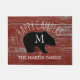 Le cadeau à la maison en bois rustique mignon et personnalisé de décor pour des rvers, les voyageurs retirés, les randonneurs, les campeurs, l'ours ou les amoureux des animaux, et les types outdoorsy est cette natte campante personnalisée qui indiquent des profondément satisfaits dans le lettrage incurvé par sembler manuscrit et gribouillé au-dessus d'une silhouette d'ours noir avec une initiale décorée d'un monogramme au centre. Ajoutez le nom de famille au fond dans la police lunatique. Sur un fond vieille de grange rustique le bois a peint rouge foncé traditionnel. Grand cadeau de retraite, aussi. Soyez droit à la maison devant un rv, une maison d'été ou un cabine de rondin rustique dans les bois.