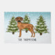 L'illustration originale de Destei d'un mignon chien de race Rhodesian Ridgeback. Le chien est placé dans une scène hivernale avec trois sapins verts et la chute de neige. L'arrière - plan est un dégradé bleu à blanc qui donne un aspect froid d'hiver. Il y a aussi une zone de texte personnalisable pour un nom.