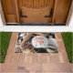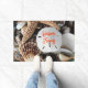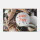 Porte de coquillages avec texte personnalisé. Une collection de coquillages de plage est l'image qui couvre ce tapis de porte qui vient en deux tailles. Un dollar de sable blanc contient du texte personnalisé. L'exemple de libellé, en orange de corail clair, est "amis bienvenus". Dans la photo sont également les jambes d'une étoile de mer / étoile de mer, coquille de pétoncle et une partie d'un oursin.
