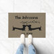 Tapis de porte avec les silhouettes noires de teckel sur un fond de texture de brun de toile. Les coeurs de flottement montrent les doxies dans l'amour. Personnaliser avec votre nom et année de mariage.