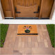 Ce tapis de porte d'Halloween présente un pot noir de brin de sorcière verte avec des jambes de sorcière à l'envers dans le pot. Texte manuscrit : Trick ou Treat. Le texte personnalisé, en bas, vous permet d'ajouter votre nom de famille.