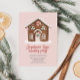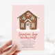 Cette invitation festive rose présente une grande maison en pain d'épices gouache et aquarelle décorée de cerise blanche et de menthe verte et rouge aux flocons de neige entourant la maison. Sur le dos de la carte, vous trouverez un motif à rayures rose et rouge. La carte comporte également une typographie vintage pour les détails de la fête et un script fantaisiste amusant pour le titre de l'événement en rouge.