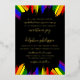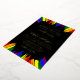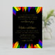 Förmliche LGBT Hochzeitseinladung in Schwarz mit Goldfolie-Schriftart und Stolz-Fahnenmalstrichen, die die formale Hochzeitsschrift in Goldtext vor schwarzem Hintergrund abstecken.