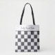 This tote bag has a fun pattern of painted black squares and plain white squares arranged in a checkerboard print. There's a spot at the top of the bag for adding a name or your own custom message in black script lettering.