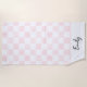 This beach towel has a pretty checkerboard print. With illustrations of painted pastel pink squares alternated with plain white squares. The lower edge of the towel is ready to be personalized with a name (or other custom text) in black script lettering.