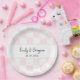 Create personalized paper plates for weddings and other special events. These paper plates have a pink and white checkerboard patterned background with painted pastel pink squares and alternating plain white squares. Your names and wedding date (or other custom text) appears in black lettering.