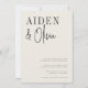Une belle typographie moderne à base de faire-part de mariage en noir cendré doux et blanc chaud. Vos noms apparaissent en haut à gauche dans une paire alléchante de scripts manuscrits et de polices serif classiques. Entrez vos noms, puis utilisez l'outil de conception pour ajuster la taille et le positionnement si nécessaire. Personnalisez avec vos détails de mariage dans les lettres serif classiques alignées en bas à droite.