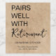Feiern Sie stilvoll den Ruhestand mit diesem Weinlabel "Pairs Well with Retirement"! Dieses individuelle Label ist eine lustige und nachdenkliche Ergänzung zu jeder Flasche und ist ein perfektes Geschenk für Mitarbeiter, Freunde oder Familienmitglieder, die ihr nächstes Abenteuer beginnen. Schälen Sie einfach und bleiben Sie dabei, um ein einzigartiges und unvergessliches Rentnergeschenk zu schaffen.