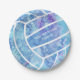 Diese niedlichen Party-Teller mit Volleyball-Thema haben ein blaues Farbthema mit lila und türkisfarbenen Akzenten und zeigen die Kontur eines einfachen Volleyballs - ein doodle Muster aus Paislien, Blume und Federn in weißen Bezügen bis auf eines der texturierten Bekleidungsstücke des Volleyballs - personalisieren Sie Ihre Botschaft - von katz_d_zynes