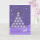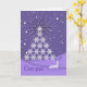 Con paz, Mit Ruhe auf Spanisch, Weihnachtsbaum und Hirschkarte. Weihnachts Grußkarte in Violett lila. Auf der Karte finden Sie einen Weihnachtsbaum aus Schneeflocken, eine dunkle lila und silberne Sternexplosion und ein cremefarbenes, anmutiges Hirsch. Art, Bild und Vers Copyright © Shoaff Ballanger Studios, 2024.