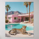 Bringen Sie kühne, sonnengetränkte Farbtöne in Ihre Zuhause mit diesem beeindruckenden Kunstdrucken mit einem majestätischen Leoparden-Swimmingpool an einer traumhaften Retro-Rosa Palm Springs Zuhause. Mit mächtigen Palmen, Bergrücken und einem Vintagen Glanz vereint dieses Stück die perfekte Mischung aus Wildnis und Chic.
