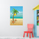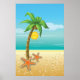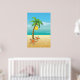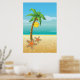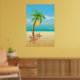 Palm tree and sun tropical scenery print/poster, featuring a tropical scenery: a palm tree with coconut on a sandy beach with starfish, blue sea/ocean water and the sky with the sun and clouds.