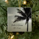 Gedenken Sie eine Hochzeit in Urlaubsort der Insel, wenn Sie das natürliche Palm Tree Silhouette Beach Wedding Square Ornament mit den Namen der Braut und Bräutigam und deren Trauungsdatum personalisieren. Dieses Thema Tropen-Theme an der Küste der Hochzeit Ornament zeigt ein Naturfoto einer silhouetted Palme an der Küste des Ozeans in den Tropen.